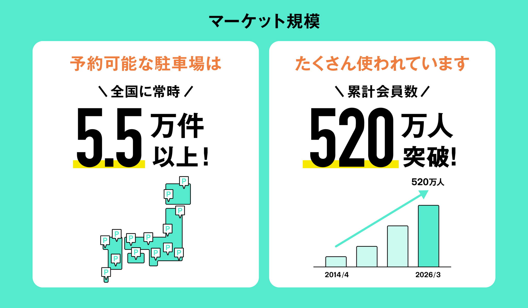 駐車場拠点は5.5万件以上、累計会員数は520万人を突破しました。